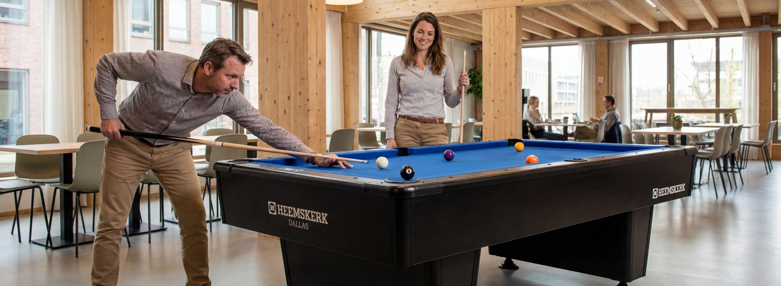 Pooltafel voor bedrijven. Op kantoor en in de bedrijfskantine zien we twee modellen die even populair zijn: de Baltimore en de Dallas. De Baltimore is beschikbaar in 7ft en 8ft en de Dallas ook in 6ft. Beide zijn leverbaar met een bedrukt laken in je eigen huisstijl, iets wat we volledig in eigen huis verzorgen.