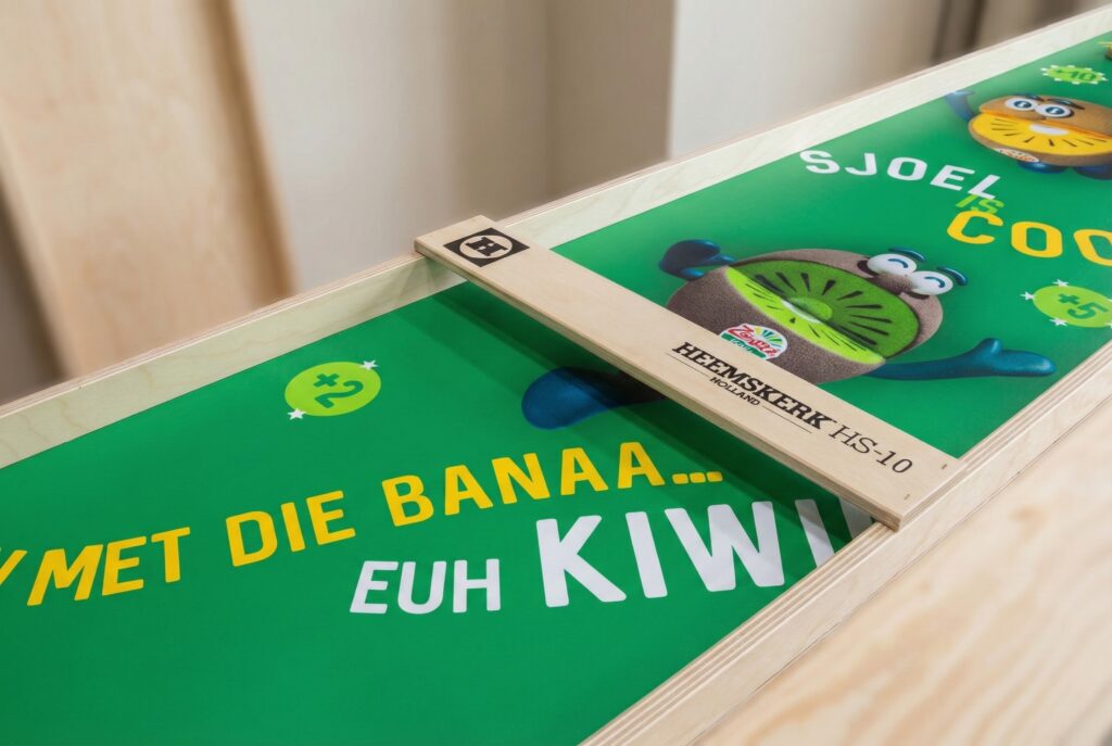 Spelenderwijs Merken: Door de sjoelschijven te bedrukken als kiwi’s, wordt de merkbeleving geïntegreerd in de actie zelf. Branding en plezier gaan hand in hand.