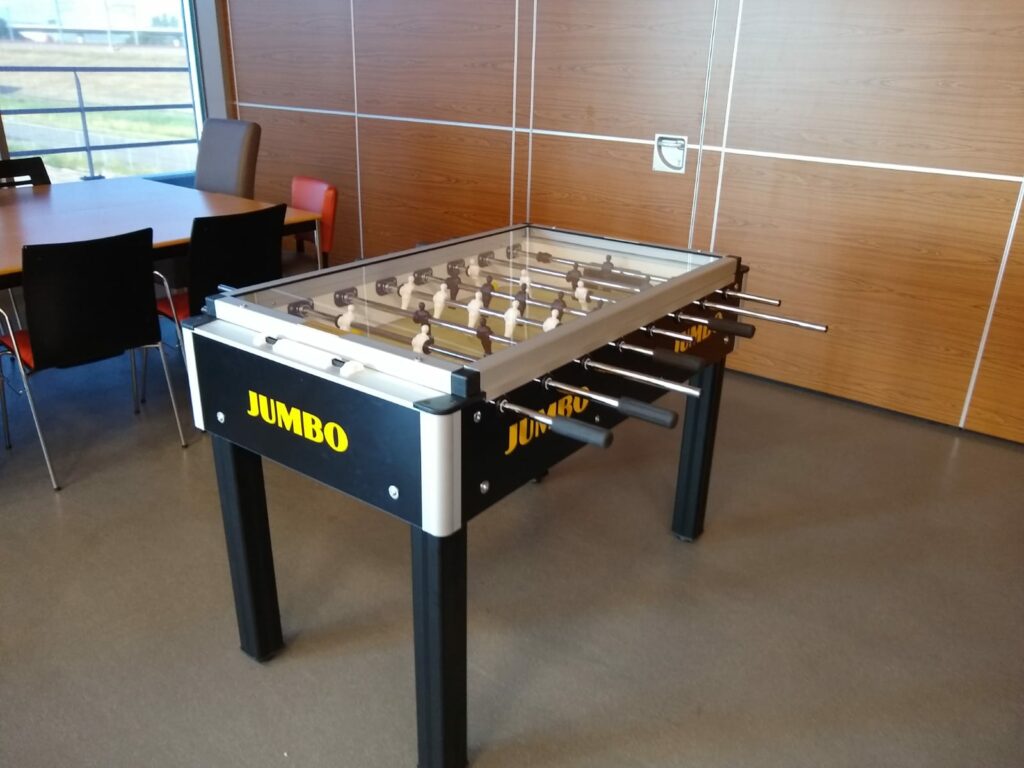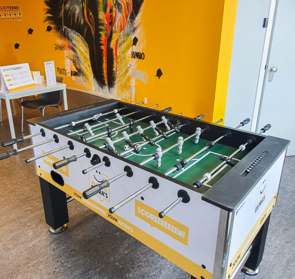 Wie kent ze niet, Jumbo supermarkten zitten vandaag de dag door heel Nederland. Jumbo is dan ook zeker één van de grotere supermarktketens. In het jaar 2020 werken er rond de 85.000 werknemers, een aantal van hun kregen als verrassing een tafelvoetbal spel voor in de kantine, geheel in de huisstijl van Jumbo. Zo kunnen de werknemers in de pauze heerlijk ontspannen tijdens een potje tafelvoetbal.