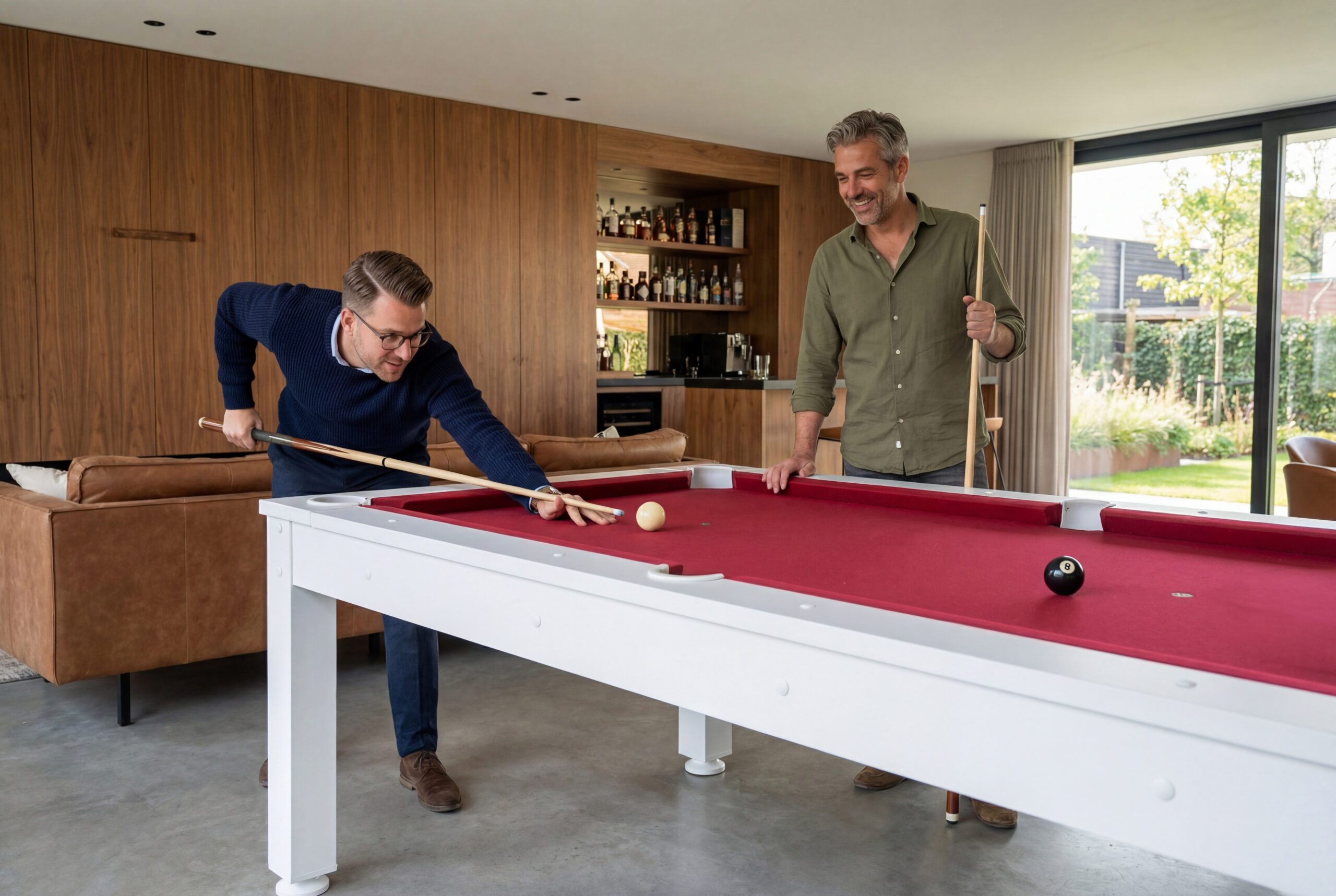 De Richmond White onderscheidt zich door zijn heldere, matwitte finish. Deze kleurkeuze zorgt ervoor dat de tafel optisch minder ruimte inneemt en perfect blendt in moderne, lichte interieurs of juist een spannend contrast vormt in een industriële omgeving. De robuuste metalen poten (90x90mm) zijn wit gecoat, wat zorgt voor een rustig, monolithisch silhouet. Het is meer dan een speeltafel; het is een stukje architectuur in je ruimte.