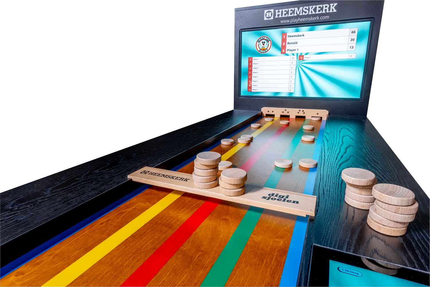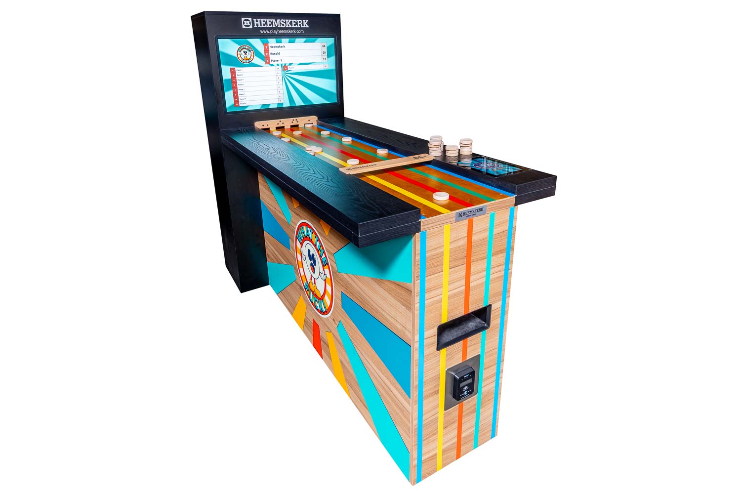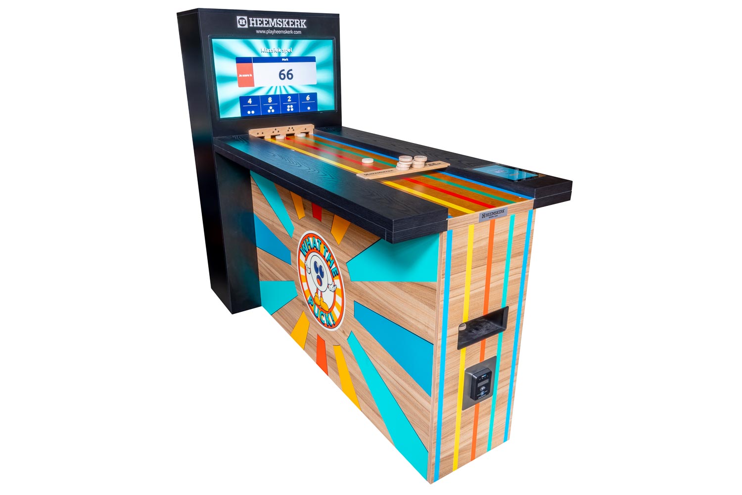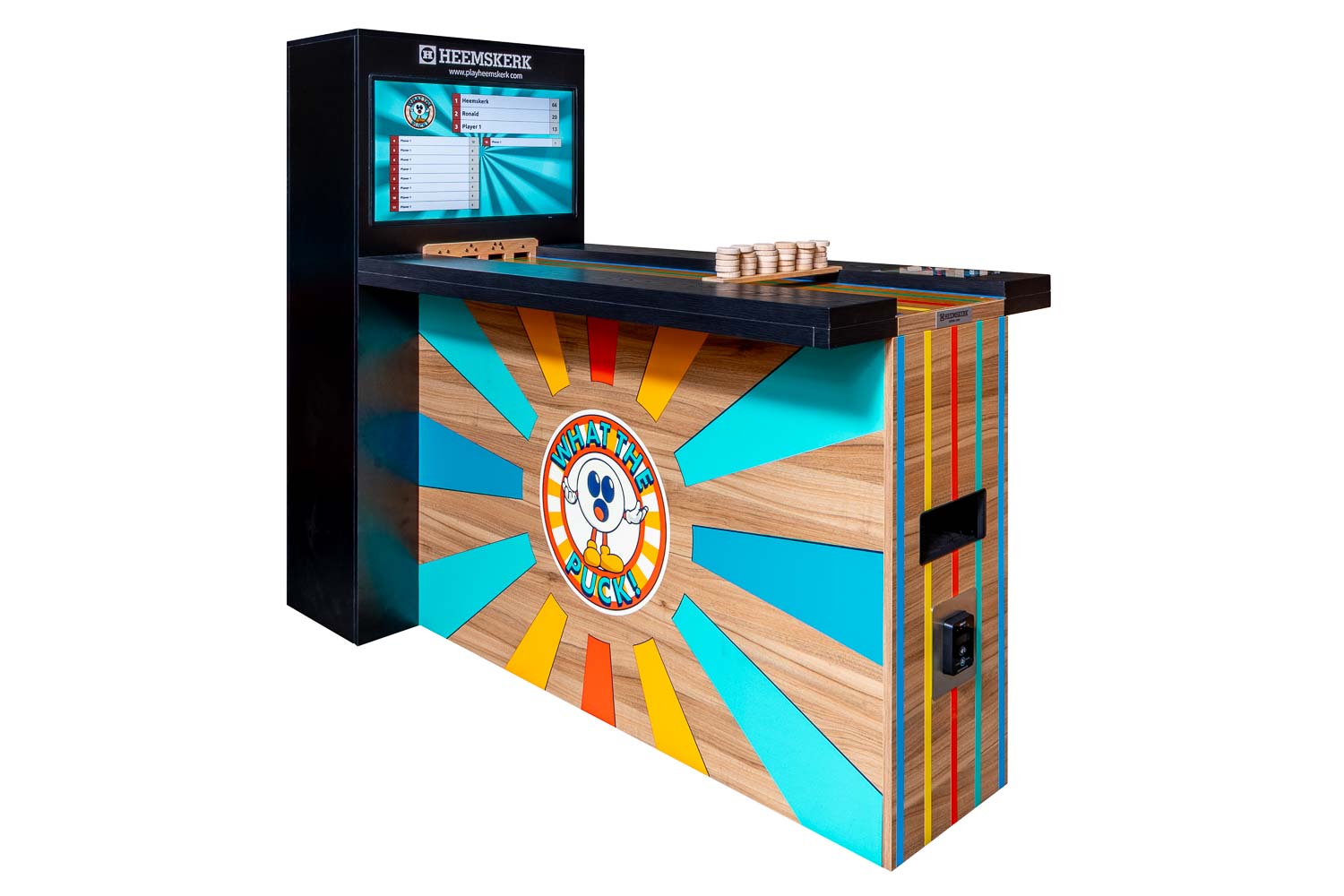 Samen met Leisure Office heeft Heemskerk de sjoel bartafel What The Puck ontwikkeld. Het oer-Hollandse sjoelen is hiermee naar een compleet nieuw niveau getild. Dit is sjoelen 2.0: geen gedoe meer met puntentelling, dat gaat volledig automatisch. Gescoorde schijven komen vanzelf terug. Ideaal toch? Dit zou zomaar dé nieuwe hit in de horeca kunnen worden. What The Puck is klaar voor kroegen, speelruimtes en evenementen. Deze digitale sjoelbak is dus breed inzetbaar.