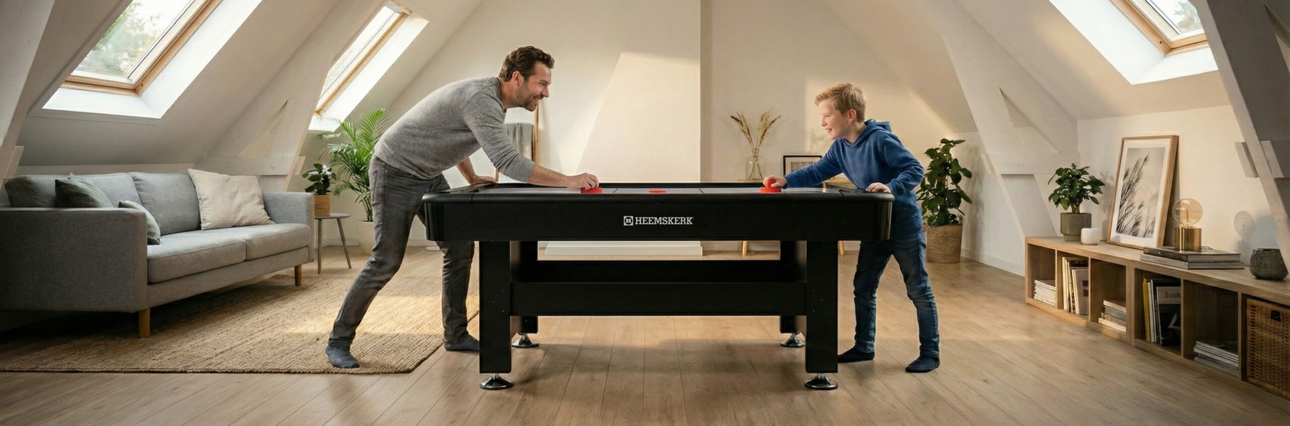 Breng actie in huis met de airhockeytafels van Heemskerk. Speciaal ontwikkeld voor thuisgebruik, zonder concessies te doen aan plezier. Of je nu zoekt naar een instapmodel voor de kinderen of een 6.5ft airhockey tafel voor je eigen game room: bij ons vind je de perfecte match. Kwaliteit waar je jarenlang plezier van hebt.