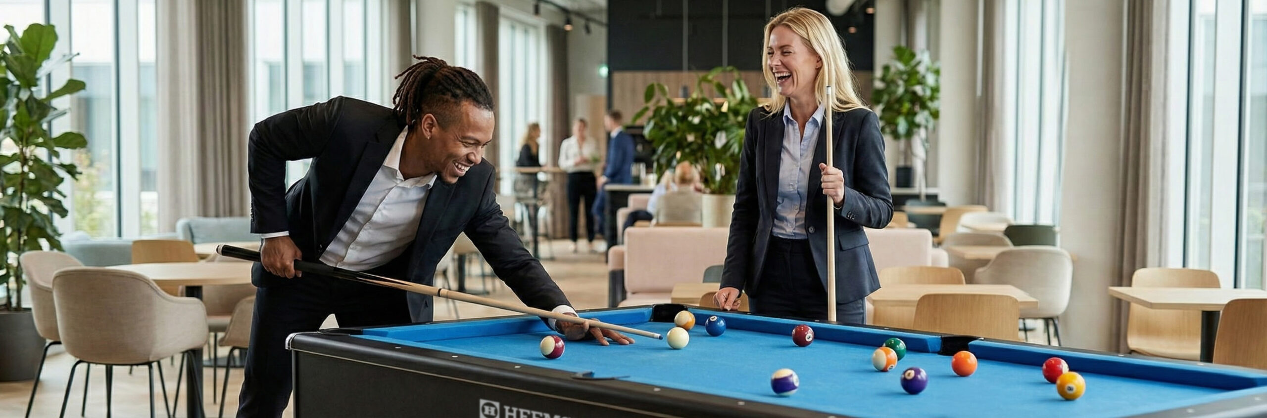 Waar een voetbaltafel zorgt voor energie en lawaai, brengt een pooltafel op kantoor focus en rust. Het is de ultieme toevoeging aan een ontspanningsruimte waar medewerkers het hoofd kunnen leegmaken. Daarnaast werkt een mooie pooltafel als een magneet op klanten en sollicitanten; het laat zien dat er binnen het bedrijf ruimte is voor plezier en kwaliteit.