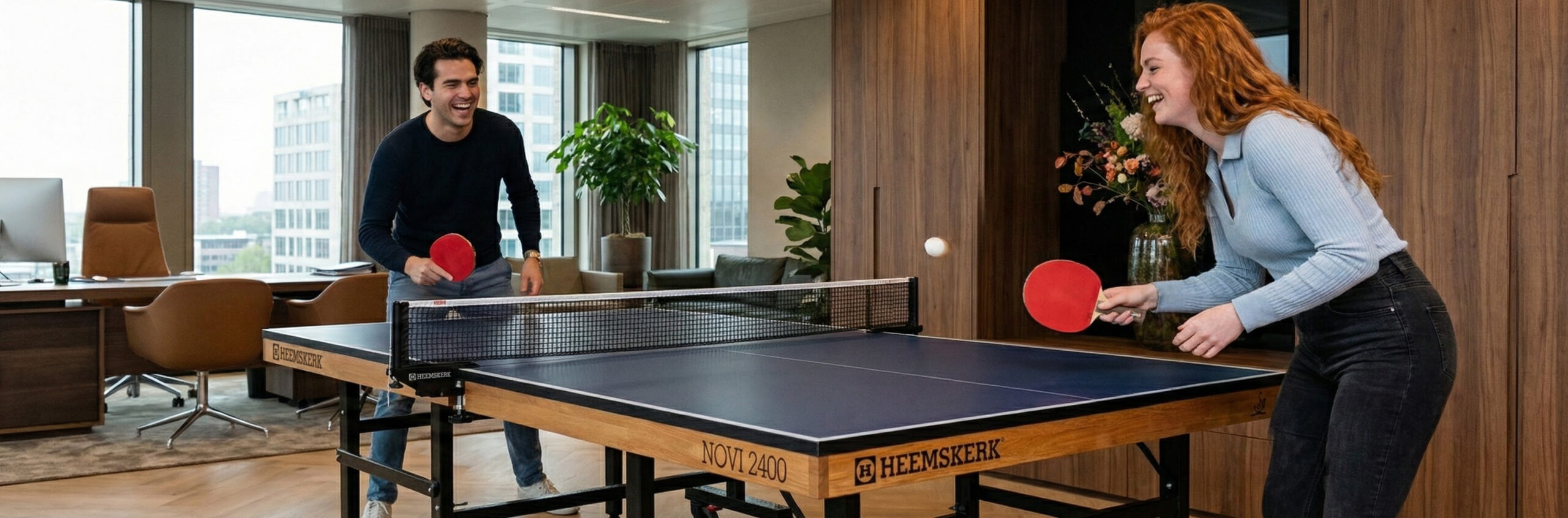 Tafeltennistafels voor Kantoor & Bedrijf. Boost de energie en sfeer op de werkvloer met een Heemskerk tafeltennistafel. Even weg achter dat bureau voor een potje pingpong zorgt voor een frisse blik en meer verbinding tussen collega’s. Of je nu zoekt naar een inklapbare tafel voor de kantine of een stijlvol designmodel voor in de vergaderruimte; wij hebben de perfecte match voor jouw kantoor.