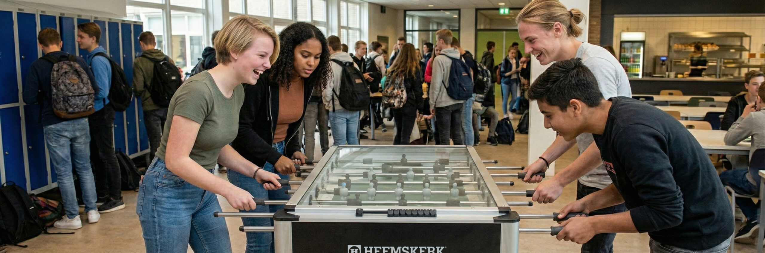 Hufterproof voetbaltafels voor scholen. Zoek je een voetbaltafel die intensief gebruik in de aula of kantine overleeft? Onze Heemskerk voetbaltafels voor scholen zijn speciaal ontwikkeld voor het onderwijs: oersterk, veilig en onderhoudsarm. Van modellen met een glazen afdekplaat tegen balverlies tot robuuste tafels voor op het schoolplein. Laat leerlingen hun energie kwijt kunnen op de beste speeltafels van Nederland.