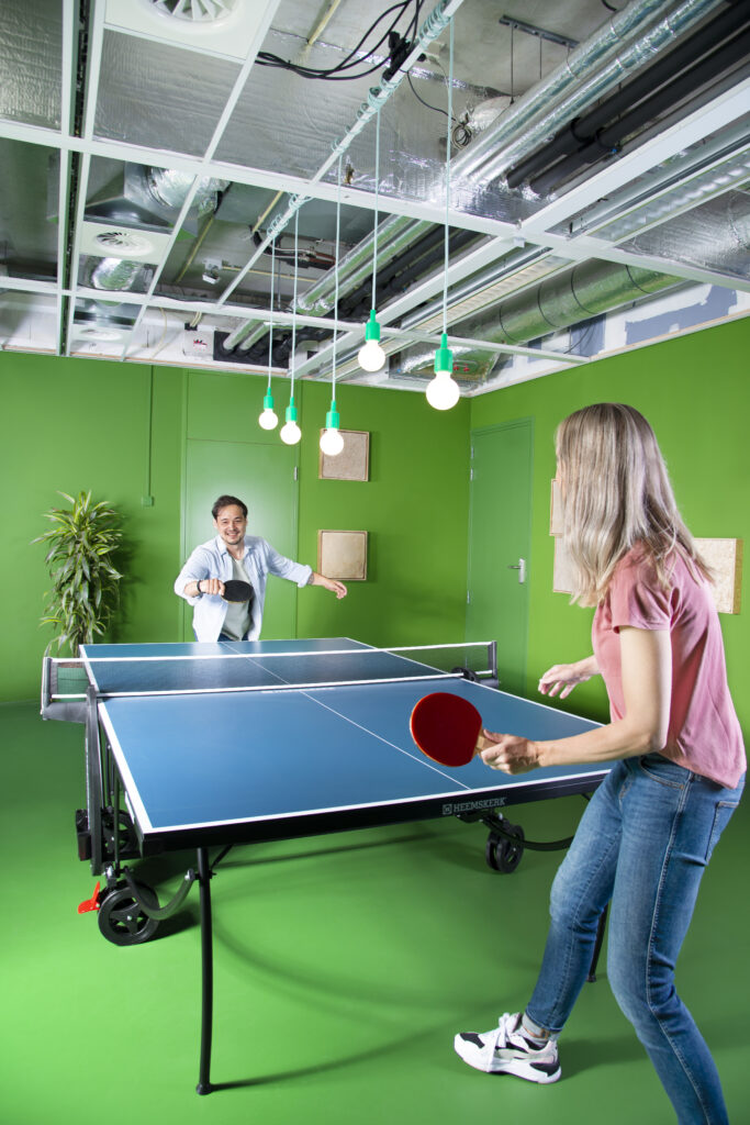Een tafeltennistafel wordt vanzelf een ontmoetingsplek. Collega’s uit verschillende teams lopen even langs, spelen een paar punten en raken makkelijker met elkaar in gesprek.