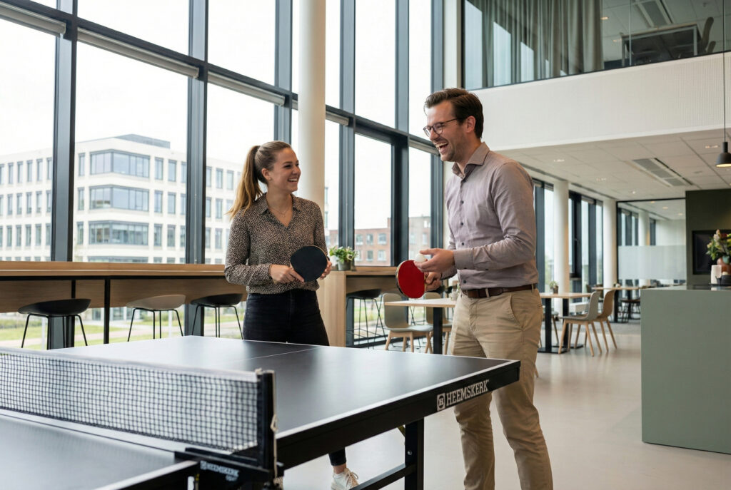 Een tafeltennistafel wordt vanzelf een ontmoetingsplek. Collega’s uit verschillende teams lopen even langs, spelen een paar punten en raken makkelijker met elkaar in gesprek.