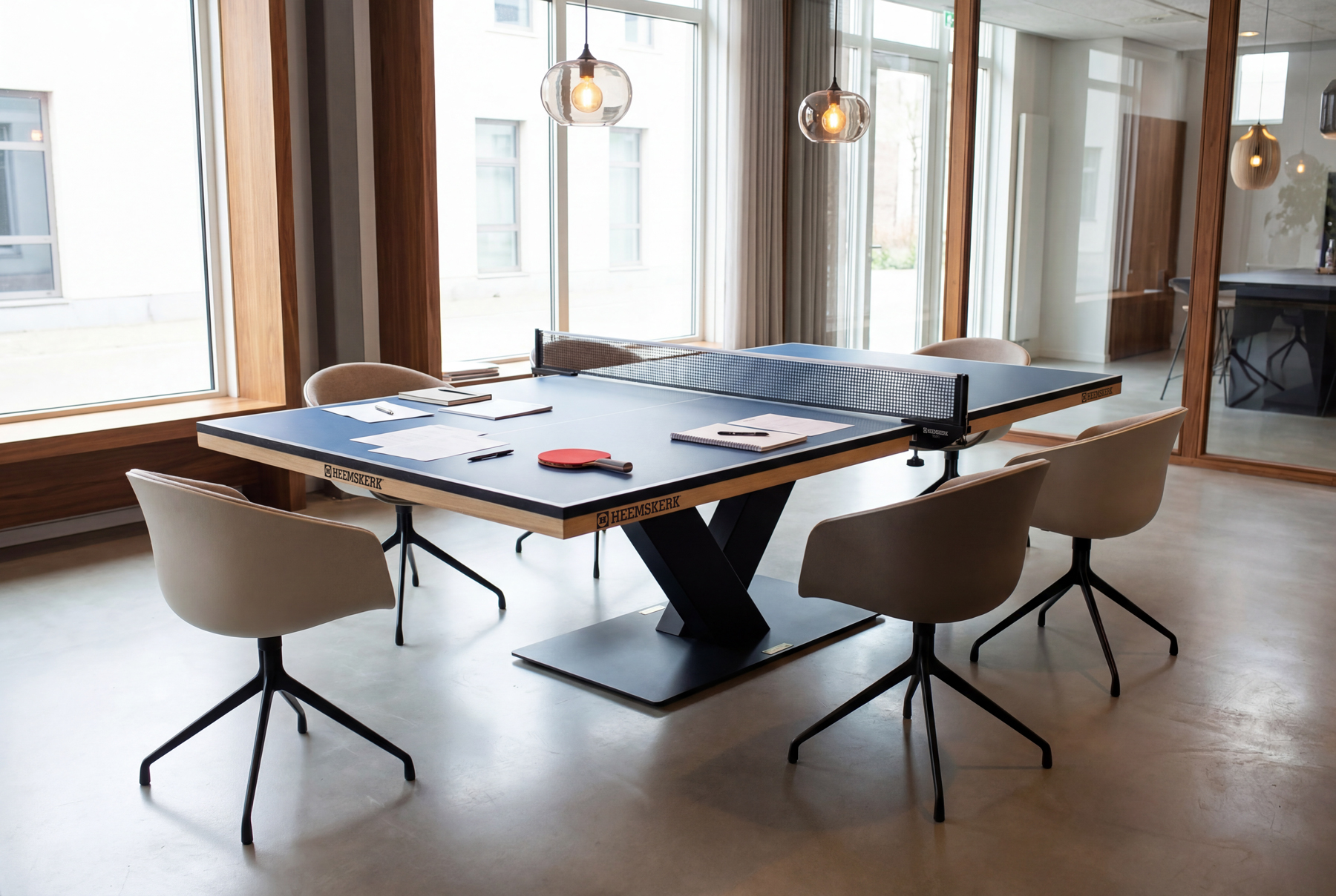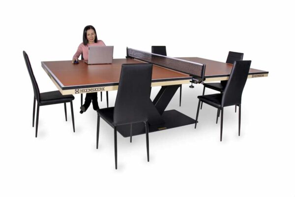 Bespaart ruimte door vergadertafel en pingpongtafel te combineren