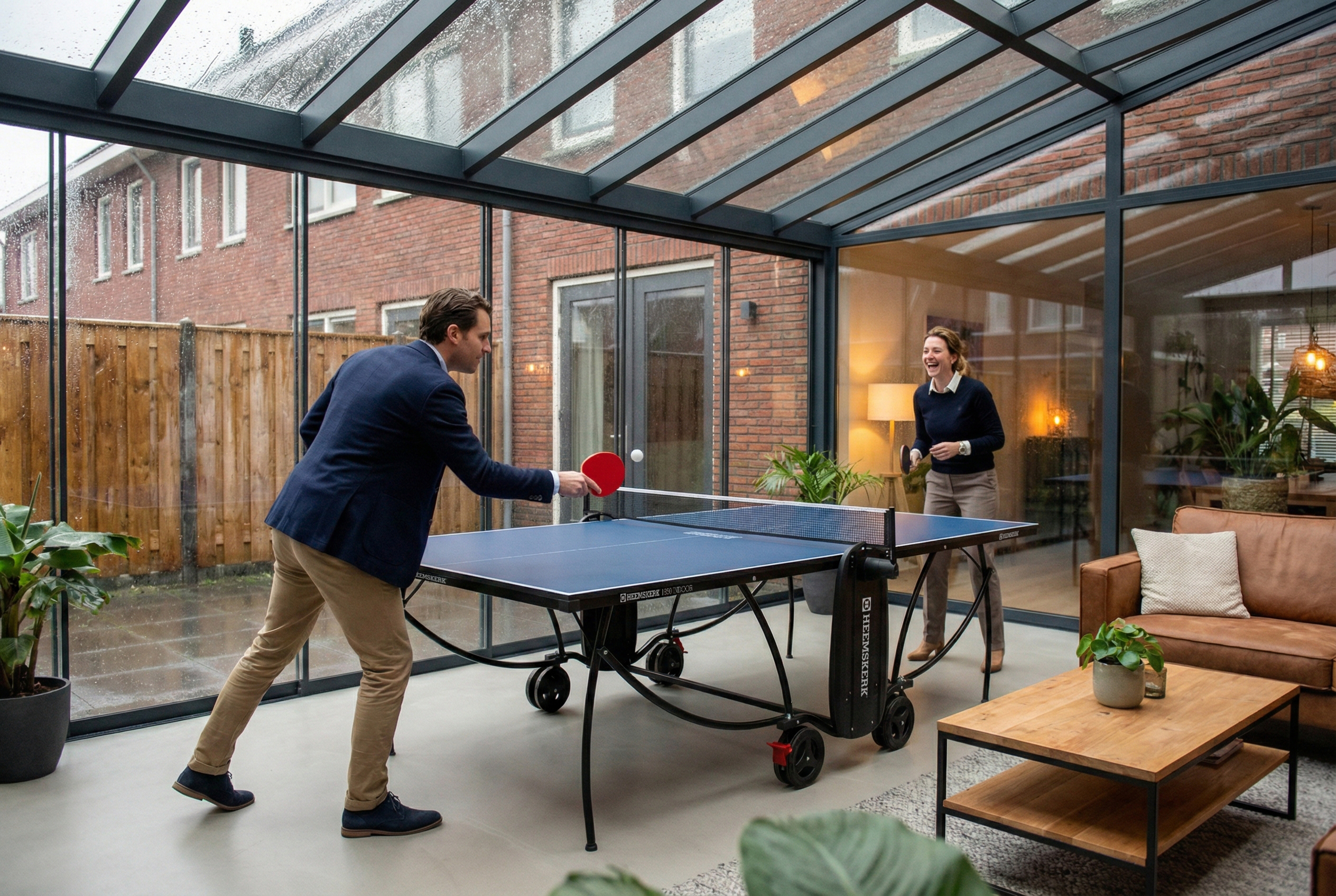 Deze tafeltennistafel is makkelijk inklapbaar.