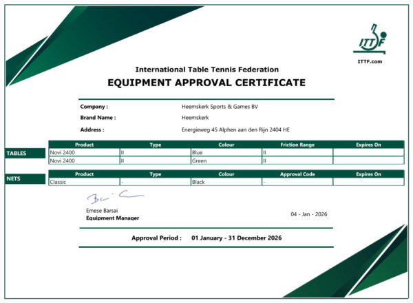 Door de ITTF en NTTB gekwalificeerd als officiële wedstrijdtafel