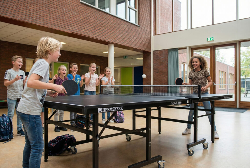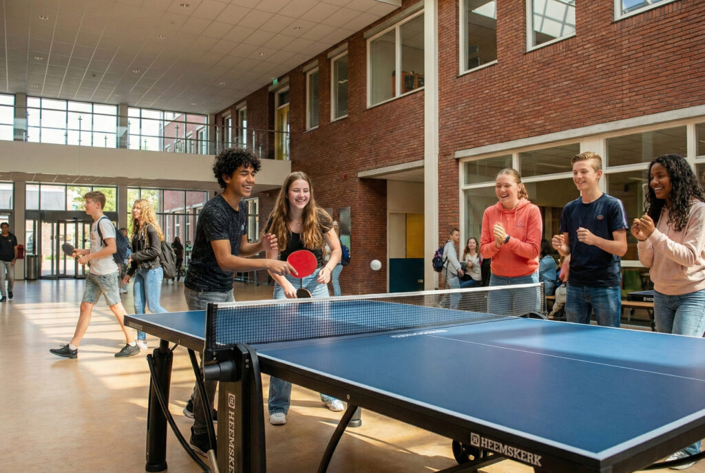 Daarom zie je tafeltennistafels steeds vaker op schoolpleinen, in aula’s, sportzalen en leerpleinen. Ze voegen beweging toe, zonder dat het voelt als “sport”. Ze bieden ontspanning, zonder dat kinderen wegvallen uit het ritme van de dag. En ze zorgen voor contact tussen leerlingen die elkaar anders nauwelijks spreken.