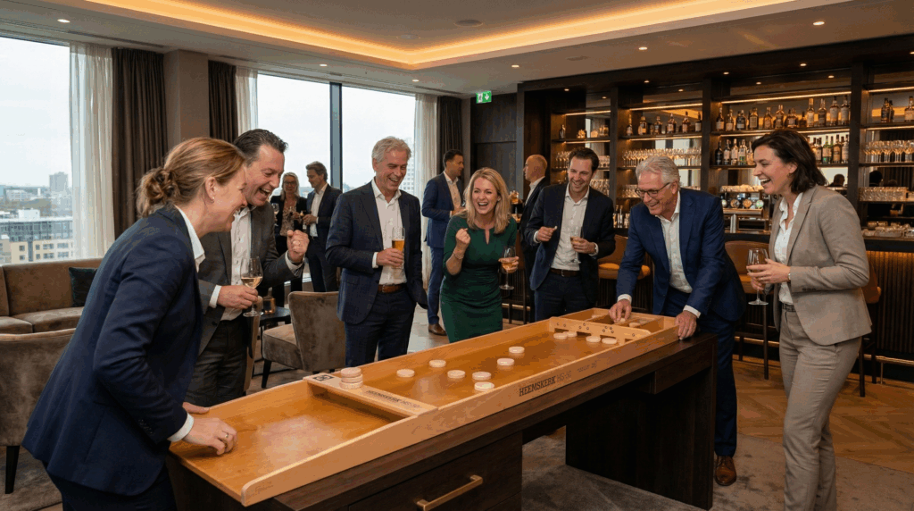 Heemskerk sjoelbakken komen uit onze eigen fabriek in Polen. Dat betekent dat we elk onderdeel zelf controleren, van het glijoppervlak tot de poortjes. Het betekent ook dat we onderdelen op voorraad hebben als er iets kapotgaat, en dat we sjoelbakken kunnen bedrukken met een eigen logo zonder tussenpartij.